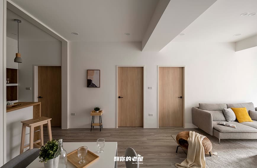 此間改造是採用北歐風格,預算限制格局沒有修改太多,比較偏向輕裝修搭配質感家具,再有限的預算下,打造出一家三口的夢想家,整體空間牆面採用莫蘭迪跳色設計,搭配淺木色家具點綴,整體明亮舒適,衛浴的部分我們調整了入口,並且增加了壁龕做為收納與端景,整體空間舒適感加分!
