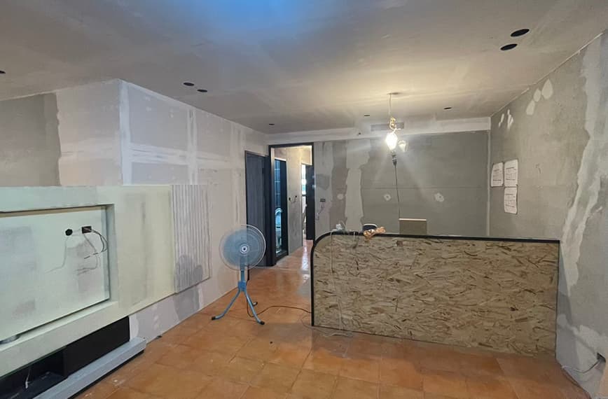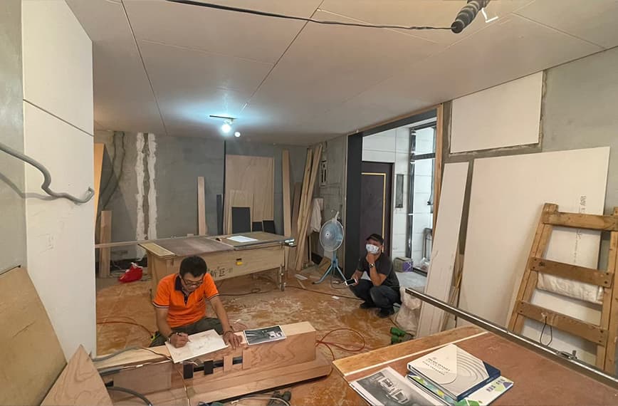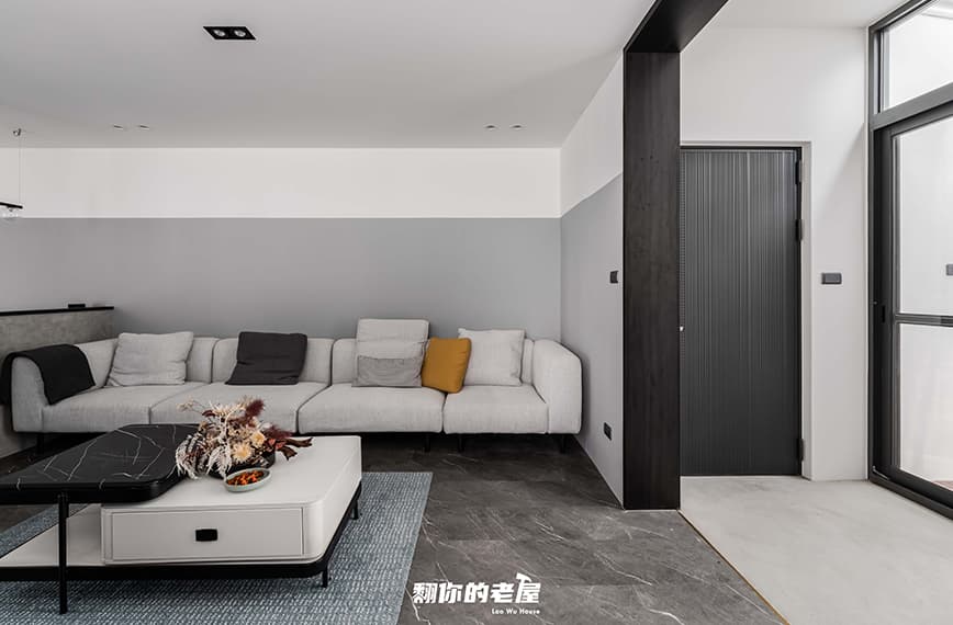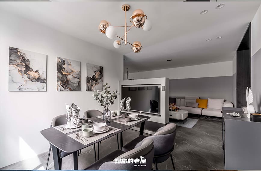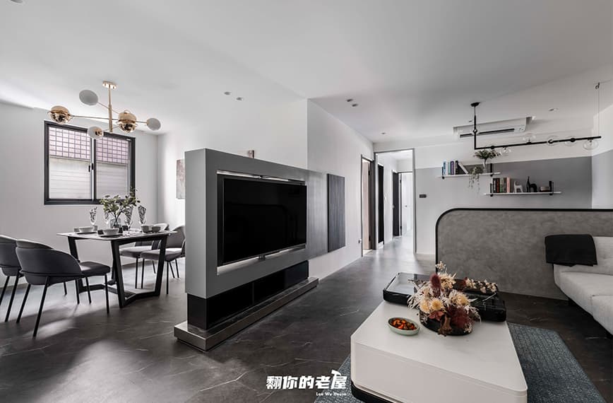 此間改造是採用現代簡約灰階的風格,整體顏色以灰白黑為主色調,俐落的顏色分隔讓整個空間有一種時尚的感覺,搭配一些造型鐵件、特殊設計電視牆等,整個空間的氛圍和諧一致,在喧囂的都市裡營造星級飯店感。