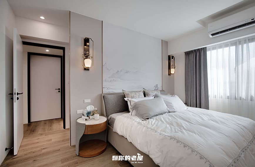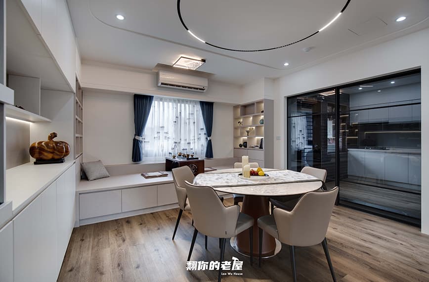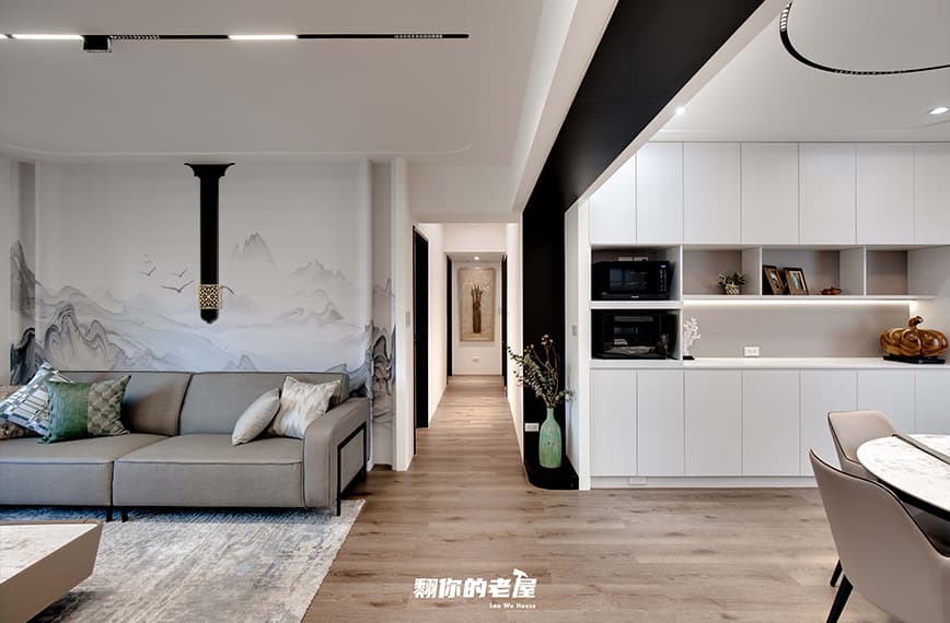 此次改造是在新中式的基礎上帶入現代元素設計,業主希望入戶後視野是一個通透大氣的空間,這樣可以容納多人聚會,也希望以後年紀大了在裡面生活可以兼顧無障礙空間的規劃,保留原廚房位置改為半開放式廚房,客餐廳為一字型設計,窗邊設計休閒茶室,可休閒可辦公,室內配色及風格考慮中式風格過於保守,故而使用山水意境的定制壁佈和造型墻壁來減少時代感的下墜,讓整體空間達到明亮不陳腐的視覺效果。