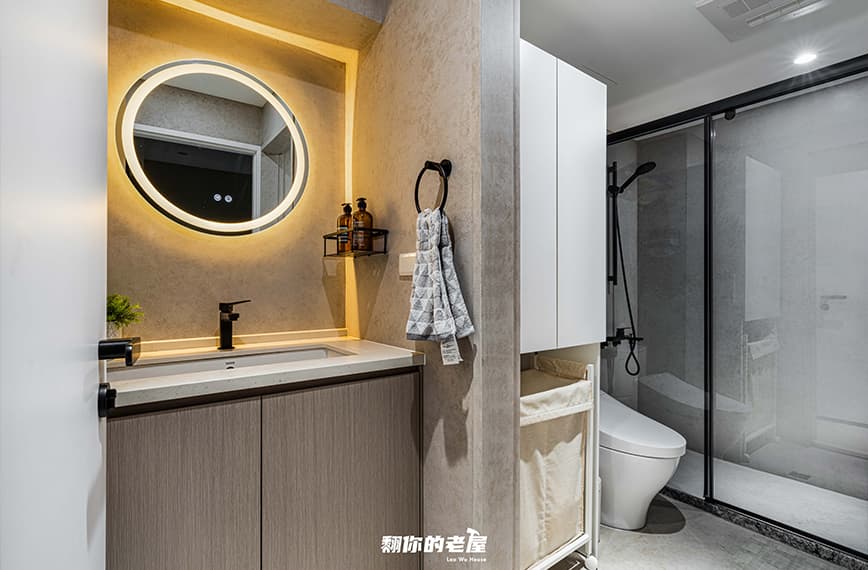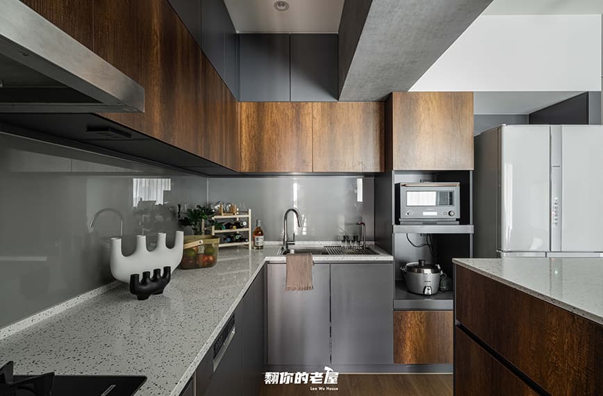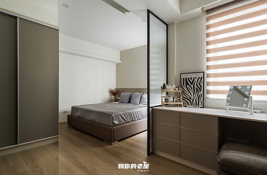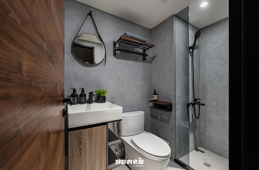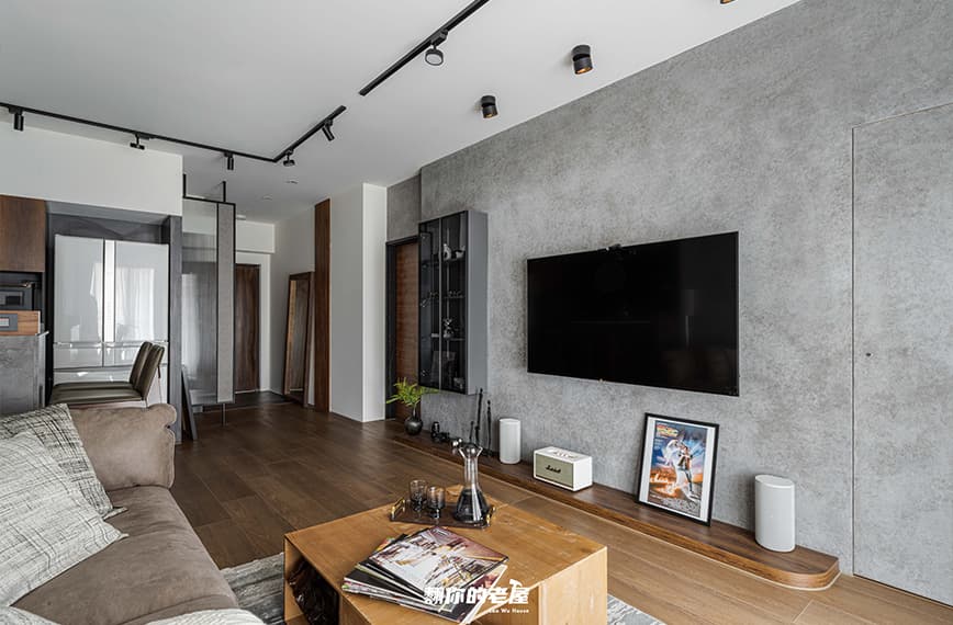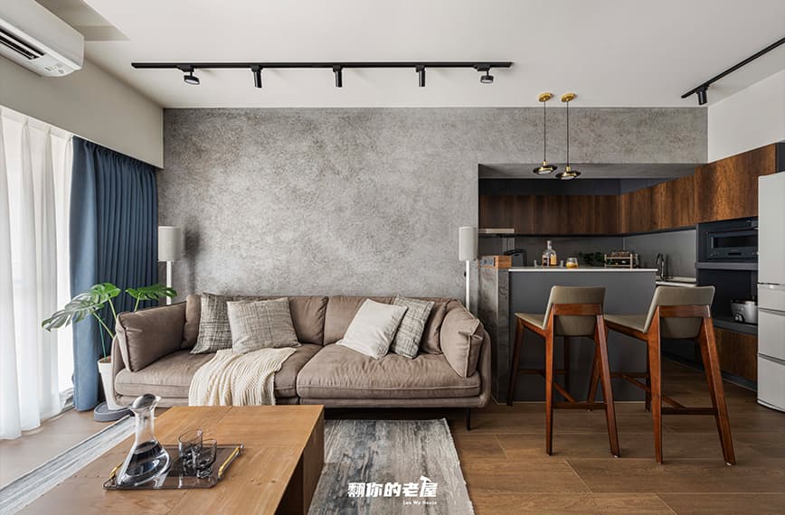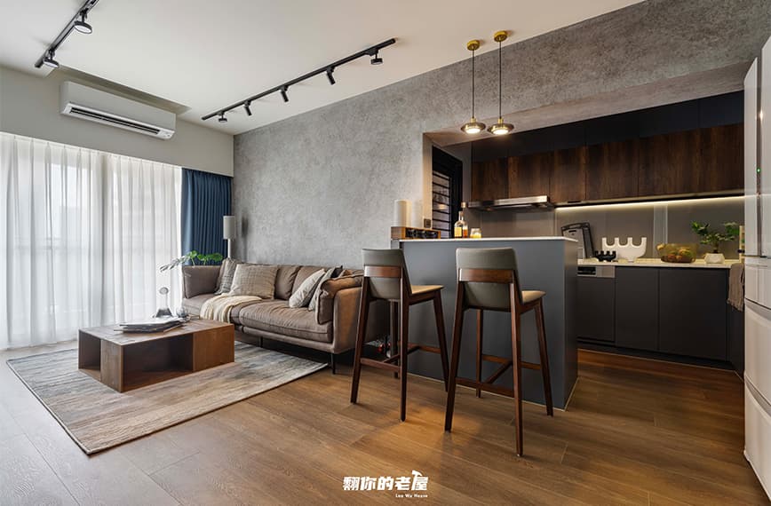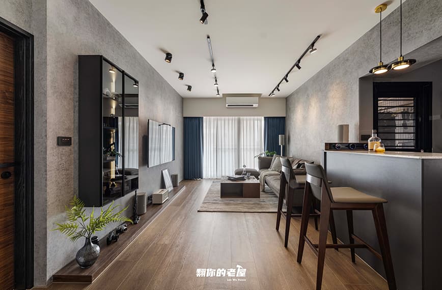 這次業主是年輕人,喜歡工業風格但家裡長輩不希望屋內陰暗且過於粗曠,利用燈光及配色,讓這家擺脫以往大家對於工業風的刻板印象,夜晚時,利用光氛層次染造出工業風質感,櫃體設計搭配木紋與鐵灰使整體工業風在這空間更為豐富,臥室內採用奶白色系,清晰擁有放鬆,溫潤柔和的色調,打造寧靜的基礎,延續工業風的態度將內外廁所使用後製清水模,使質感與粗曠色造成衝擊,達到清晰個性的質感與量感。